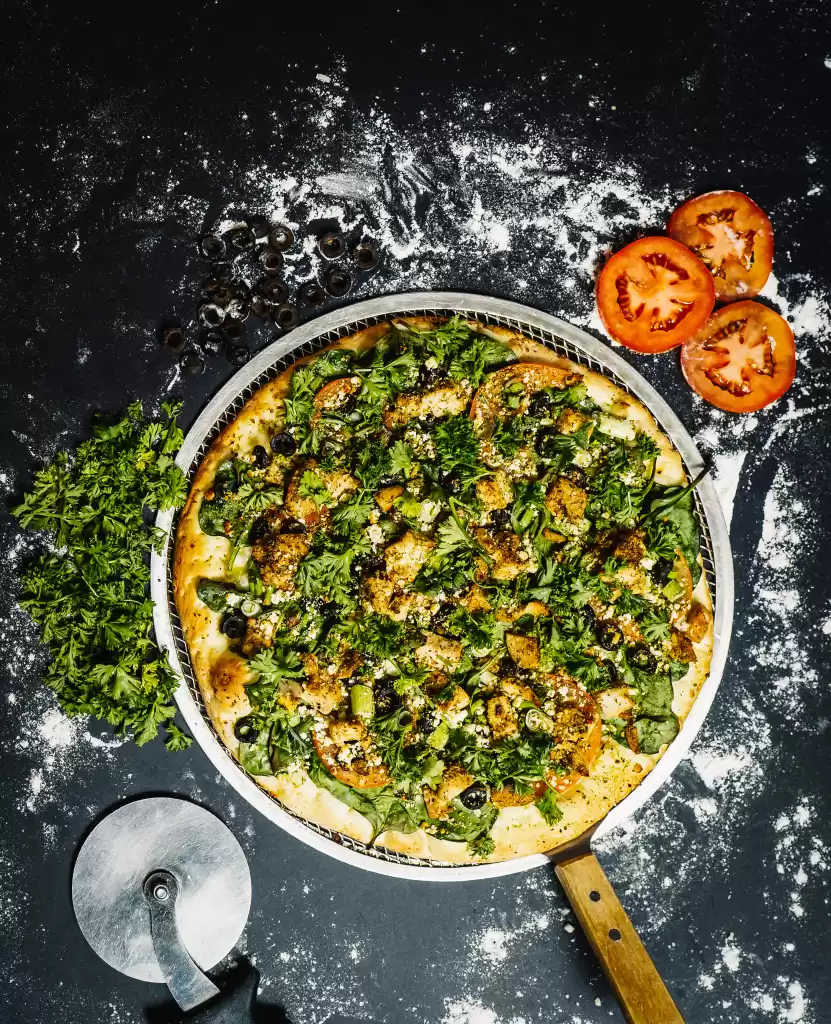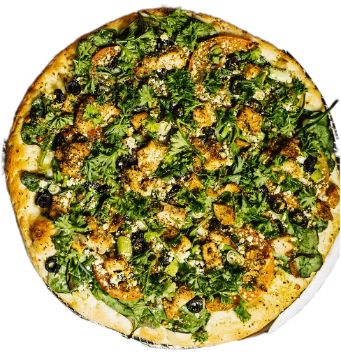 No mozzarella. Olive oil, spinach, tomatoes, feta, chicken, Parmesan, green onions, black olives, olive oil, garlic & parsley.