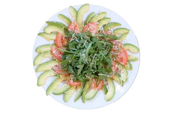 Arugula, sliced avocado, tomatoes, Parmesan, black pepper, sea salt, olive oil, and fresh lemon juice.