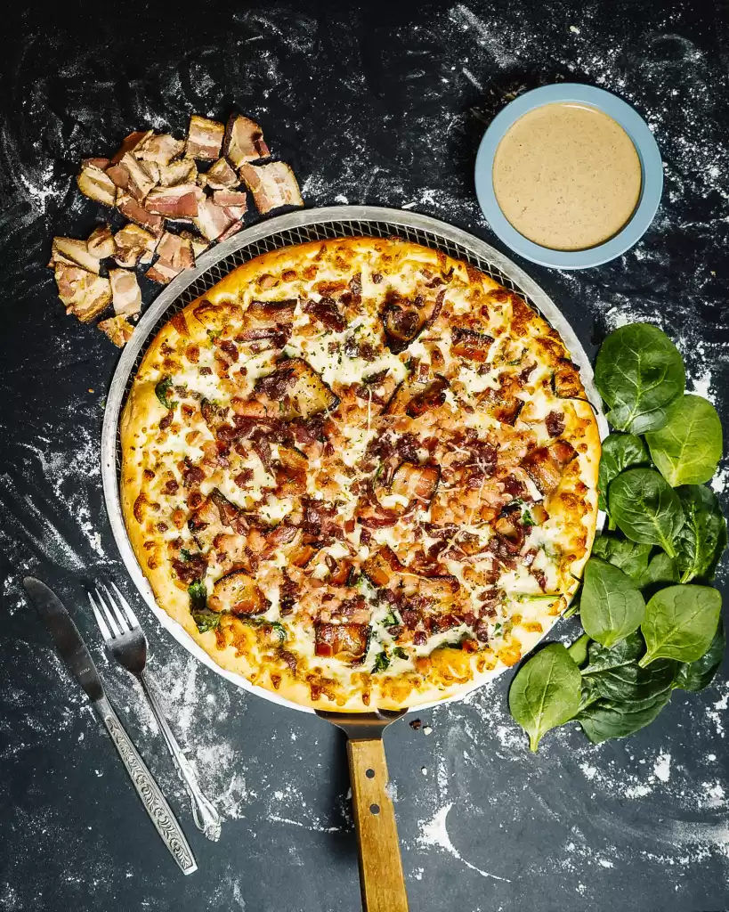 White sauce, spinach, mozzarella, smoked bacon, crumbled bacon, caramelized onions, and herbs.