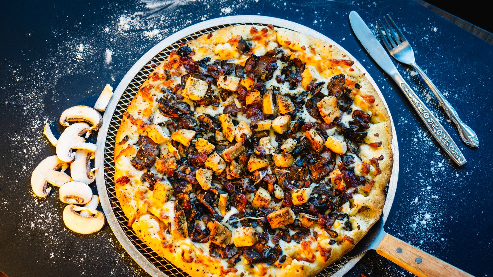 Garlic sauce, mozzarella, chicken, sautéed mushrooms, roasted garlic, caramelized onions, Romano & herbs.