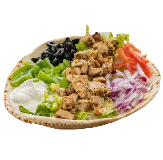 Chicken, tomatoes, lettuce, black olives, green peppers, onions, cucumber & tzatziki (On 9″ pita bread).