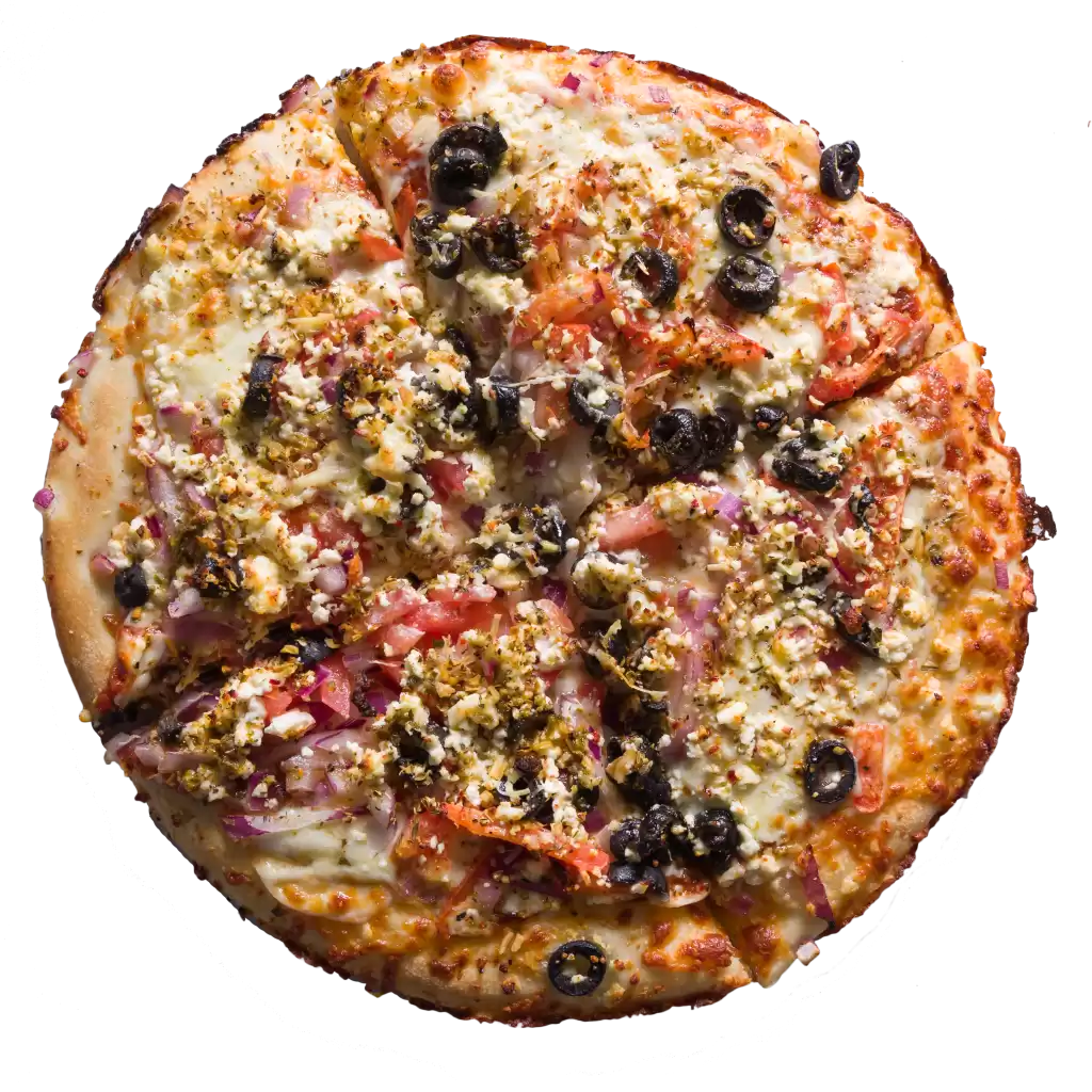 Neapolitan pizza sauce, mozzarella, tomatoes, black olives, red onions, feta cheese, a dab of extra virgin olive oil & herbs.