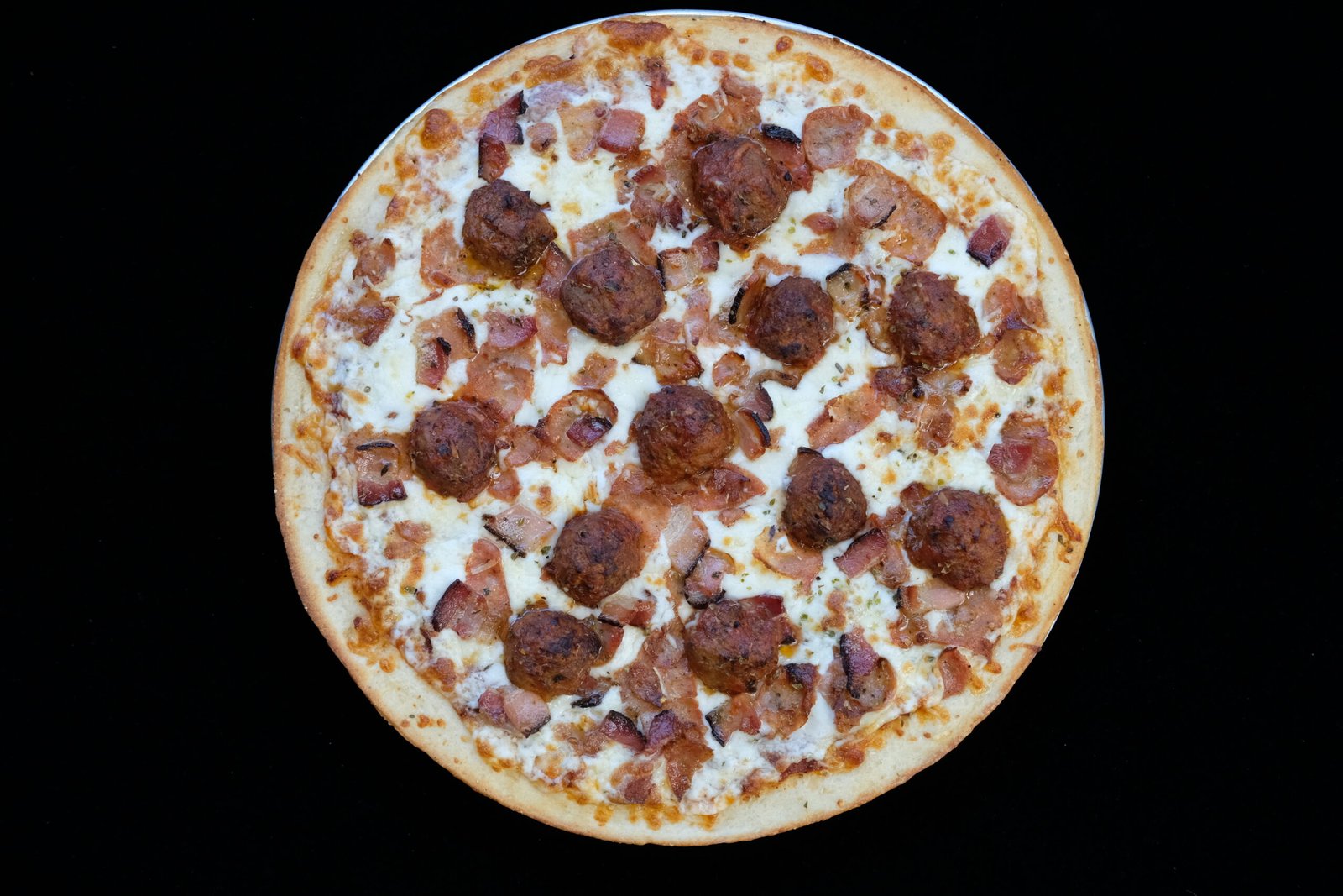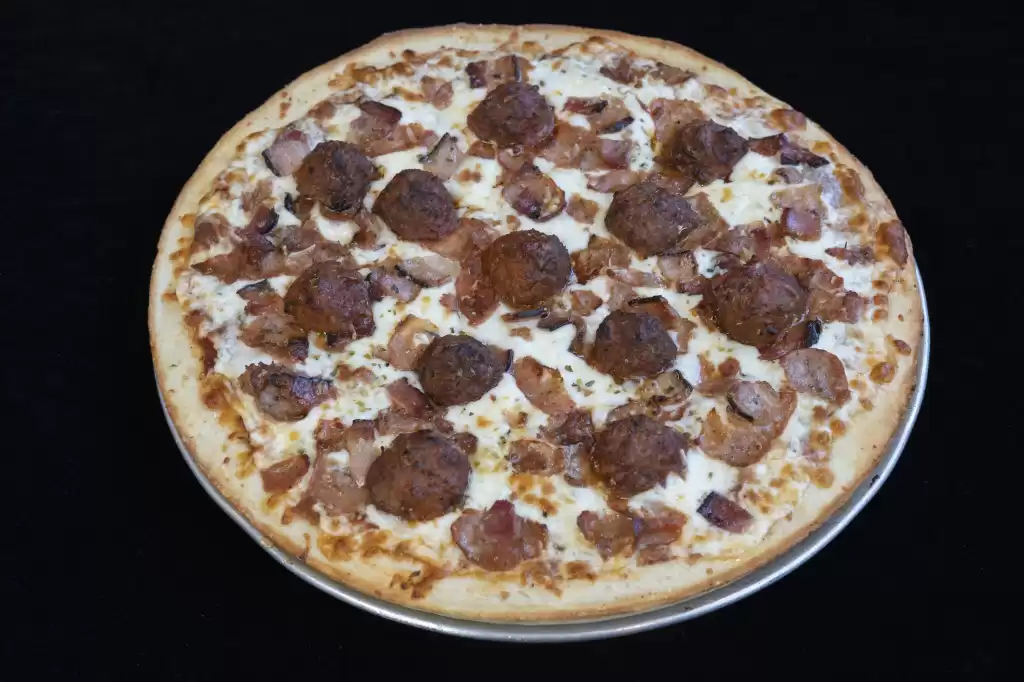 Neapolitan pizza sauce, Brothers’ hot pepperoni, mozzarella, Romano cheese, smoked sausage, Italian beef meatballs & smoked bacon.