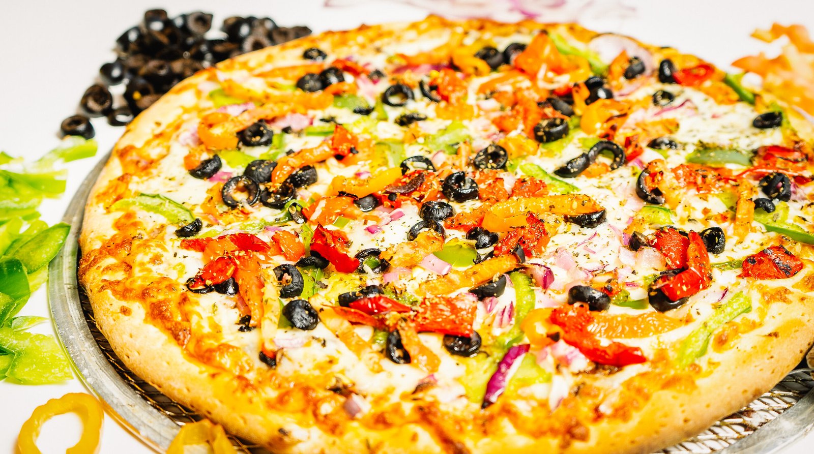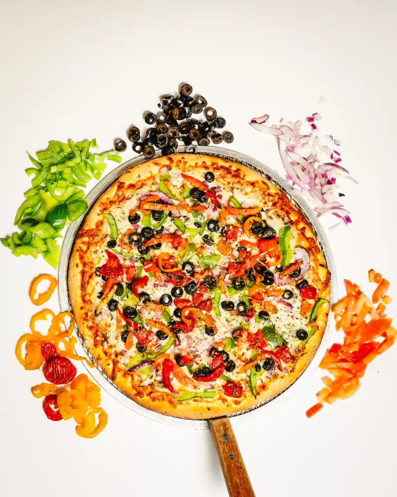 Neapolitan pizza sauce, mushrooms, onions, green peppers, black olives, hot peppers, roasted red peppers, ginger & garlic, garnished with cilantro & tomato.