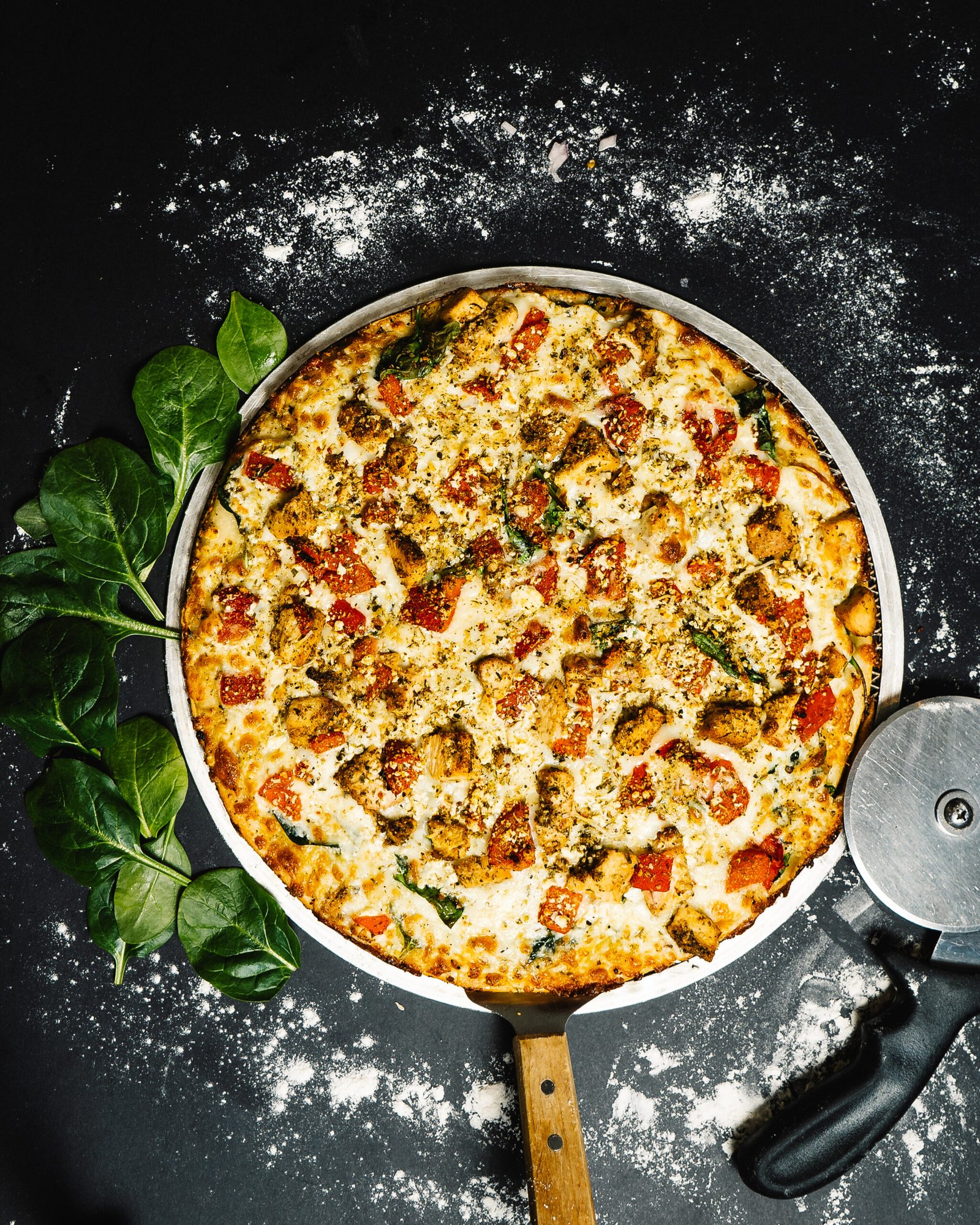 Pesto, spinach, mozzarella, chicken, roasted red peppers, feta, herbs, Parmesan & garlic.