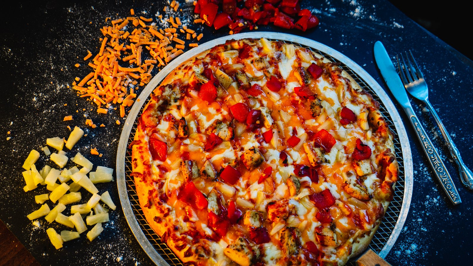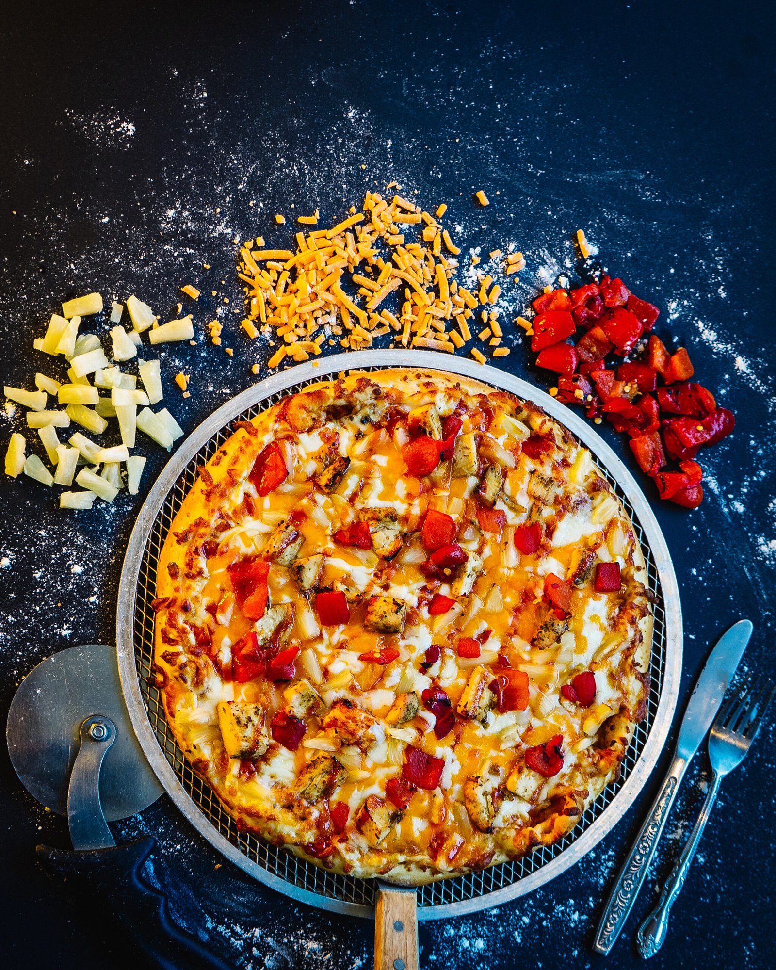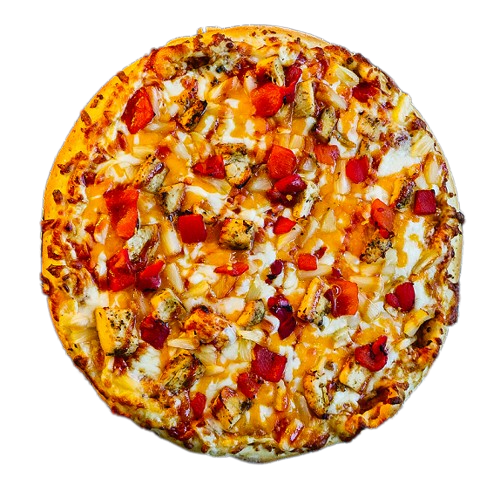 eet BBQ sauce and neopolitan sauce, mozzarella, chicken, cheddar, pineapple & roasted peppers