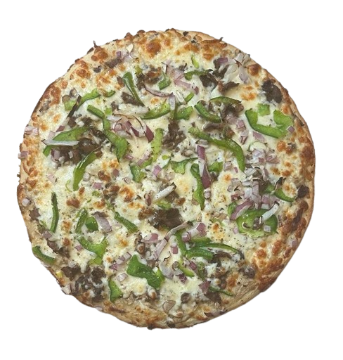 Bianco sauce, steak, mushrooms, onions, green peppers, parmesan, mozzarella, and herbs