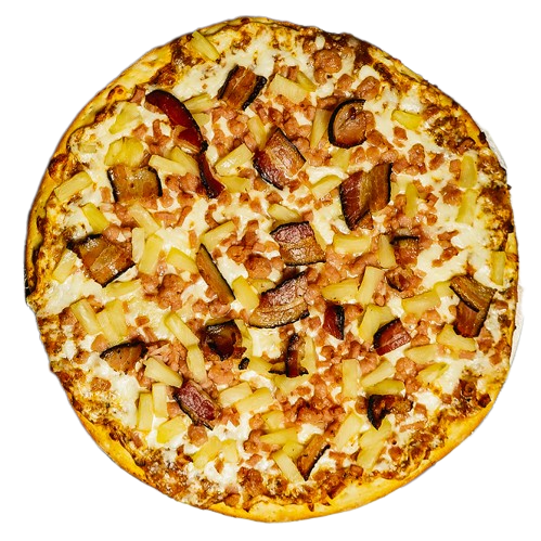 Ham, smoked bacon, crumbled bacon, pineapple, and mozzarella.