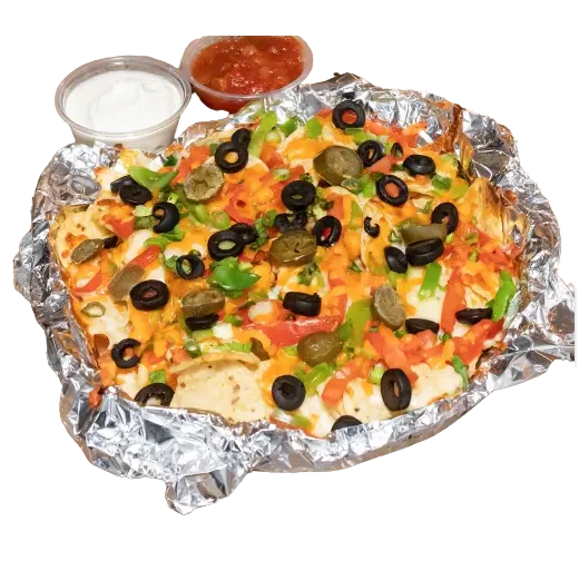 Green peppers, green onions, fresh tomatoes, mozzarella, cheddar, black olives, and jalapeños. Comes with salsa and sour cream on the side.