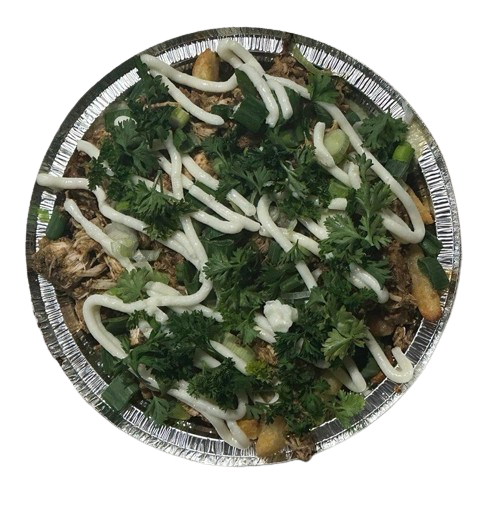 Chicken, fries, gravy, parsley, green onions, fresh lemon juice and option for cheese curds or mozzarella.