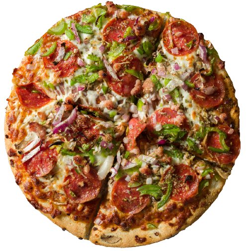 Neapolitan pizza sauce, salami, mushrooms, mozzarella, Italian pepperoni, red onions, green peppers, bacon, parmesan, & herbs.